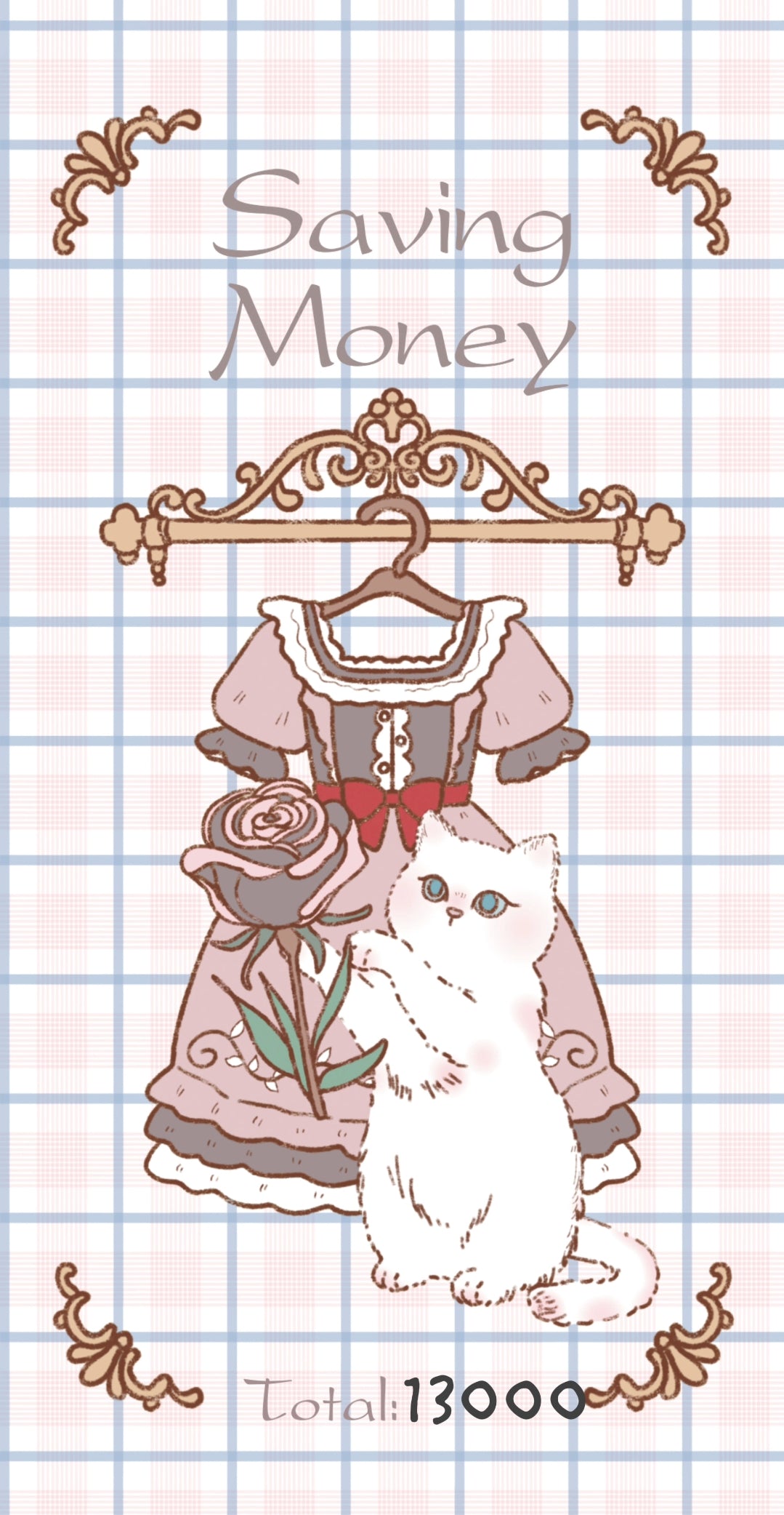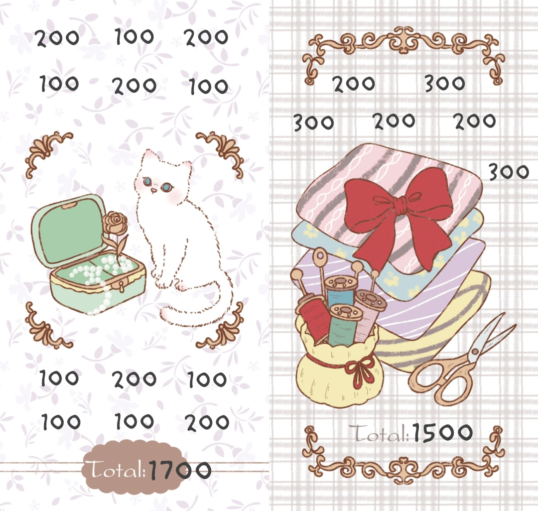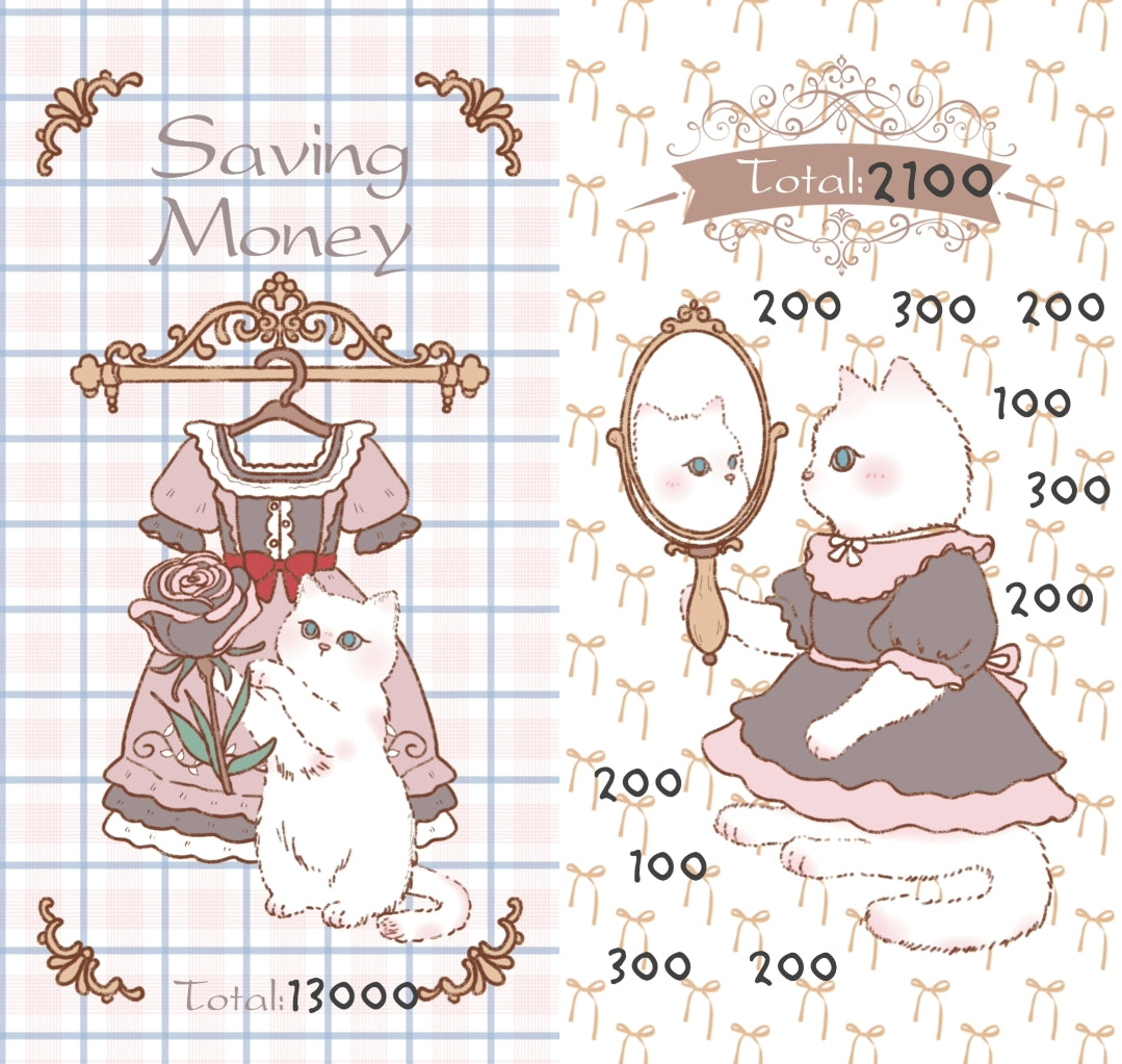 復古蕾絲洋裝與可愛小貓的插畫,搭配浪漫花朵與甜美配色,讓存錢也充滿儀式感!適合記錄目標金額,讓存錢過程更加療癒可愛